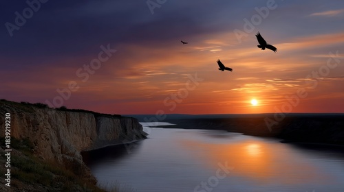Sunset serenity over river birds in flight nature landscape tranquil environment scenic viewpoint