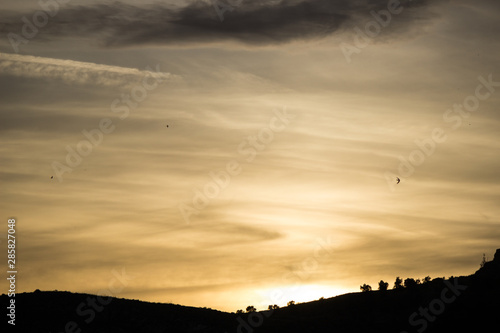 sunset with a sky of warm clouds and flying birds