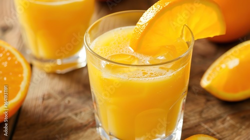 Sunshine in a Glass: Vibrant Orange Juice in Glass Visual Picture – A Clear Glass Brimming with Bright Orange Liquid, Tiny Bubbles Rising, a Thin Layer of Foam on Top, and Light Glinting Off the Surfa