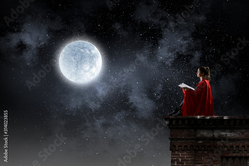 Super hero on roof. Mixed media