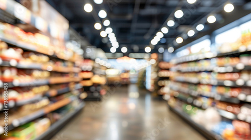 Supermarket aisle with a variety of products. Blurred background.