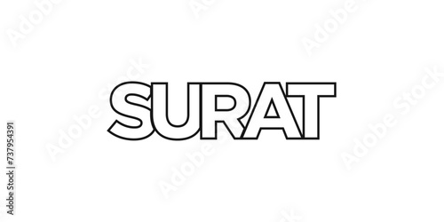 Surat in the India emblem. The design features a geometric style, vector illustration with bold typography in a modern font. The graphic slogan lettering.
