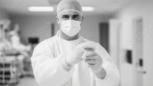 Surgeon wearing surgical gown, mask, and cap meticulously adjusts sterile gloves, preparing for an operation in a bright, sterile operating room environment