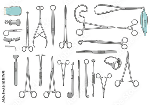 Surgical Instruments Collection: Forceps Clamps and Tools for Medical Procedures.