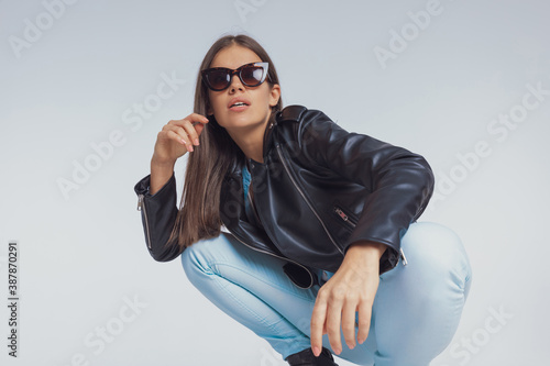 Surprised fashion model gasping while wearing sunglasses