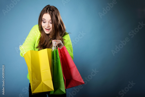 Surprised girl with paper shopping bag. Sales.