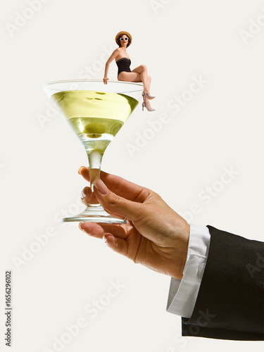 Surreal artwork. Woman in swimsuit sitting on martini glass with olives. Concept of food and beverage branding, lifestyle visuals, summer tourism promotion, and art decor campaigns.