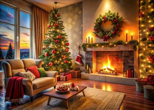 Surreal Christmas Living Room: Cozy Fireplace & Modern Decor