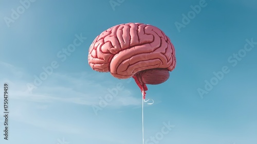 Surreal concept image of a floating pink balloon designed to resemble a human brain rising against a clear blue sky, symbolizing creativity, intelligence, mental health, innovation, and cognitive imag