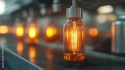 Surreal illuminated bottles in an artistic factory setting, capturing the warmth of innovation and the blend of technology with craftsmanship in a unique industrial ambiance.