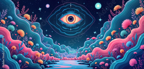 Surreal illustration abstract landscape with flowers, celestial objects. Vivid colors, wavy patterns create dreamy, ethereal atmosphere. Mystic eye in cosmos. Spiritual imagery blends esoteric