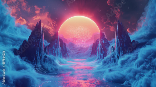surreal landscape with a large sun/moon, mountains, and hazy atmosphere with pink and blue tones. Suitable for fantasy art, sci-fi themes, or atmospheric backgrounds.