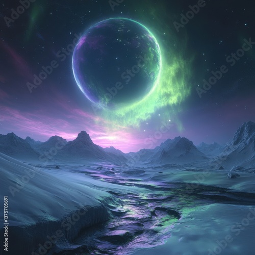 Surreal Night Landscape with Celestial Body and Colorful Aurora