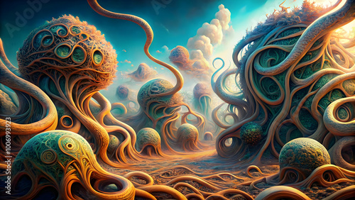 Surreal Organic Landscape: A mesmerizing, dreamlike scene with swirling, organic forms and vibrant colors, evoking feelings of wonder and the unknown.