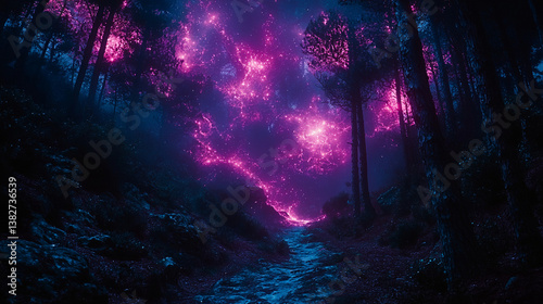 Surreal purple nebula in dark forest path, fantasy landscape, digital art, for game design