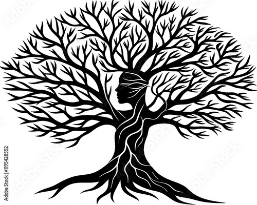 Surreal Tree Silhouette with Human Profile and Wind-Swept Branches in High Contrast