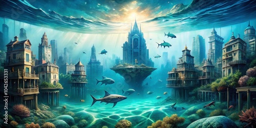 Surreal underwater cityscape with marine life amongst submerged buildings, underwater, cityscape, surreal