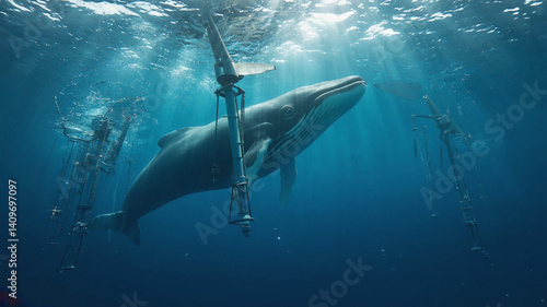Surreal underwater encounter with a majestic whale and mysterious structures