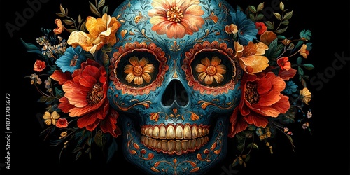 Surrealistic illustration of a Mexican sugar skull with colorful floral ornaments, centered on a black background