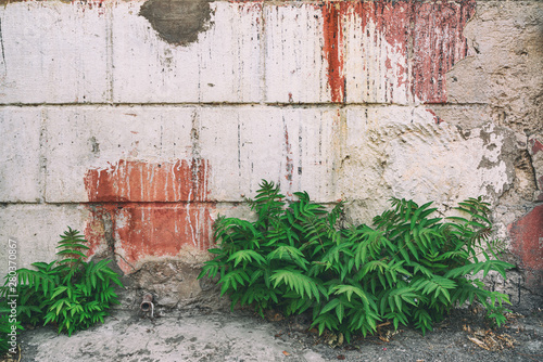 Surviving green plants near the wall of the old house
