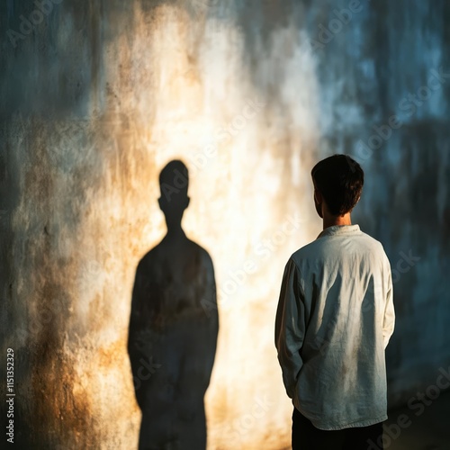 Survivor staring at their shadow imprinted on a wall, nuclear bomb, haunting memory