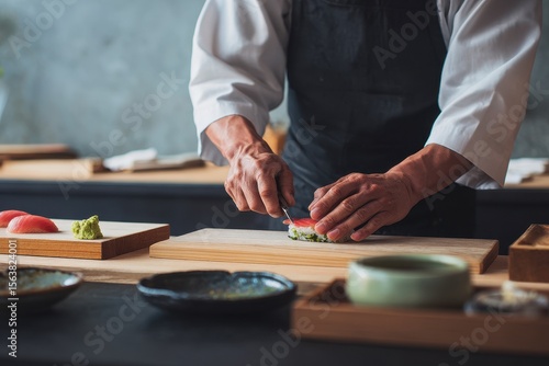Sushi chef meticulously preparing a piece of nigiri.