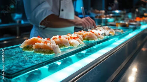Sushi on a Blue Conveyor Belt, Japanese Food, Restaurant
