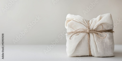 Sustainable Christmas gift wrapped in white cloth, tied with twine, eco-friendly and minimalist holiday decor, Scandinavian style, neutral tones, selective focus, copy space