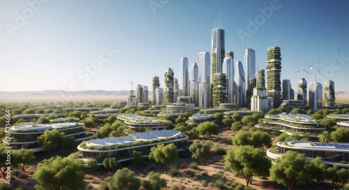 Sustainable city concept in a desert landscape with eco friendly buildings, green architecture, solar panels, and wind turbines for clean energy.