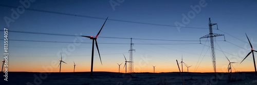 Sustainable energy concept with silhouette of wind turbines at sunset in a snowy landscape, ideal for environmental awareness campaigns and Earth Day promotions
