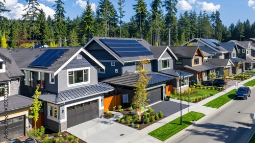 Sustainable Living Concept: Modern Homes with Solar Panels and Electric Vehicle Charging Stations