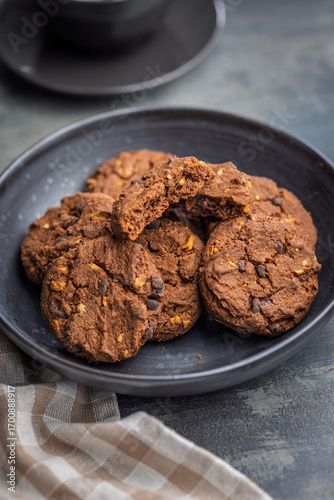 Sweet chocolate cookies in bowl on kitchen table.
