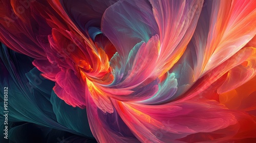 Swirling shapes and kaleidoscopic hues blend with soft feathery textures in a vibrant abstract visual symphony