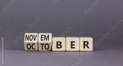 Symbol for the change from October to November. Businessman turns wooden cubes and changes the word October to November. Beautiful grey background. Happy November concept. Copy space.