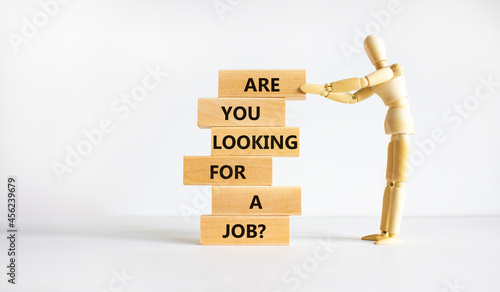 Symbol of building success foundation. Businessman model put wooden blocks on the stack of blocks. Words Are you looking for a job. Beautiful white background, copy space. Business, job concept.