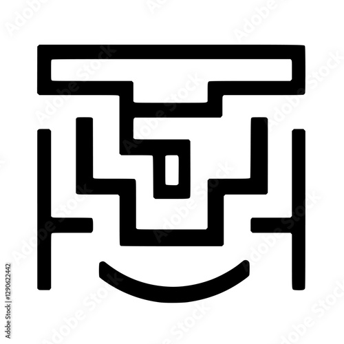 Symbolic Maze: Black geometric pattern resembling a smiling face, intricate lines and sharp corners, set against a white background.