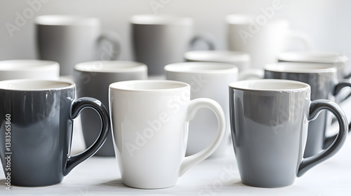 Symmetrical arrangement of coffee mugs on table minimalist setting still life photography indoor top-down view