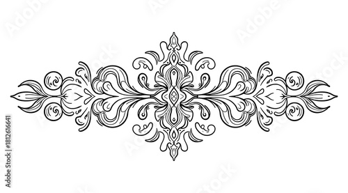 Symmetrical decorative floral element, fine linear graphics. Suitable for logos, frames and retro designs.