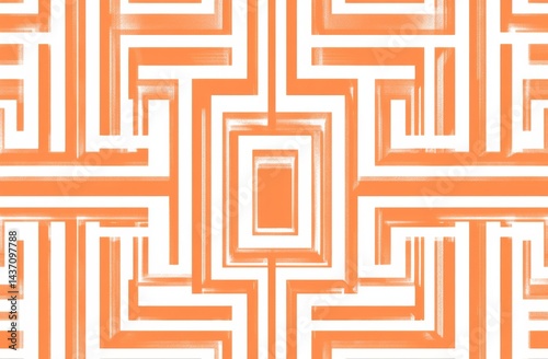 Symmetrical orange and white geometric pattern with repeating squares forming a complex maze-like design.