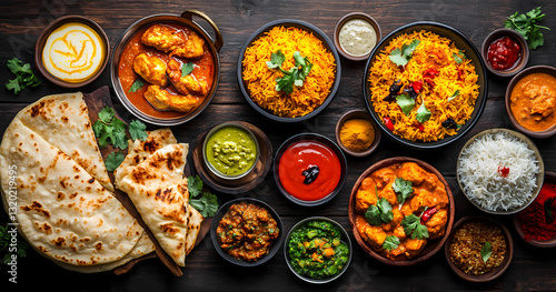 Symphony of Flavors: A vibrant composition of Indian culinary delights, where aromatic curries, fluffy rice, and tantalizing accompaniments converge on a rustic wooden surface.