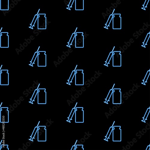 Syringe ampoule seamless pattern, bright vector illustration on black background.