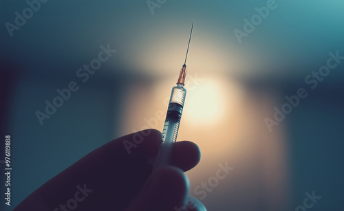 Syringe held up against warm, glowing lights, representing vaccination or medical injection.