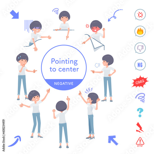 色々な方向を指差すTシャツマッシュヘア女性のセット