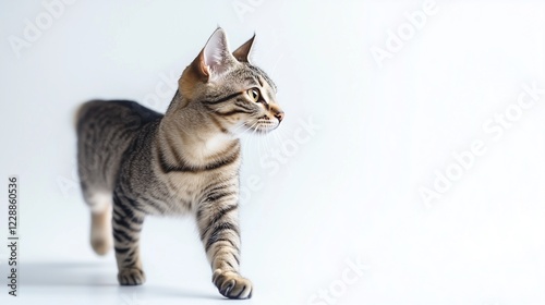 Tabby cat gracefully walking forward on white background.