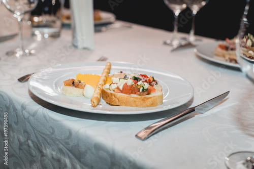 Table served for a wine tasting. Snacks with Pasta, Cheese, Vegetables. Spain tapas recipe food pintxos. Served dish for food and wine tasting