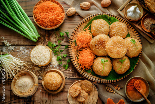 Table set with the essential ingredients for preparing the traditional Vietnamese glutinous rice sesame balls