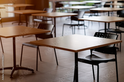 Tables and chairs that is arranged spaced or social distancing in the dining room without people.