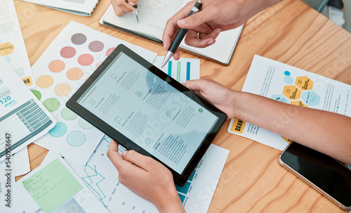 Tablet, paper charts and research for planning, startup company and reading for business process. Brainstorming, digital device and analysis for projections, idea strategy or group project innovation