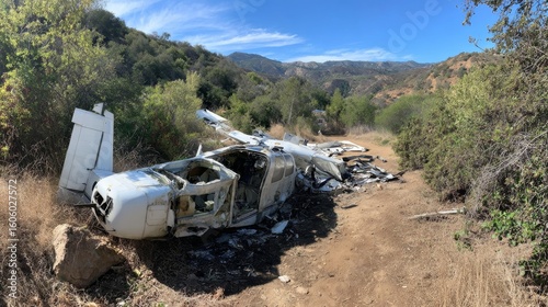 Tail fin and right wing wreckage of crashed airplane lying on its side near trees and grass in San Diego, California, USA, under clear blue sky during daytime in detailed realistic scene