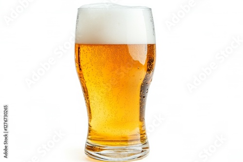 Tall beer glass with foamy head on white background. Neural network AI generated